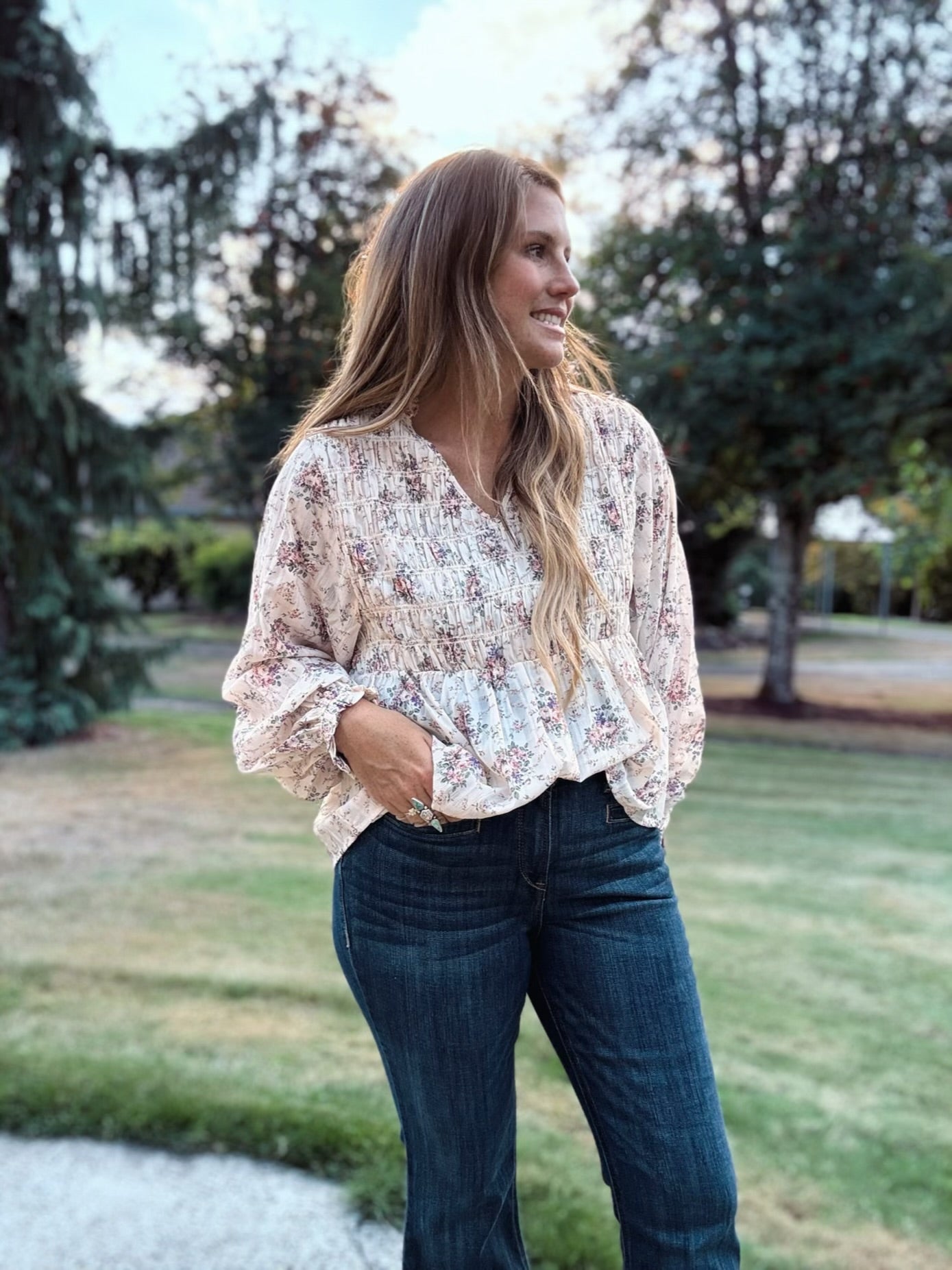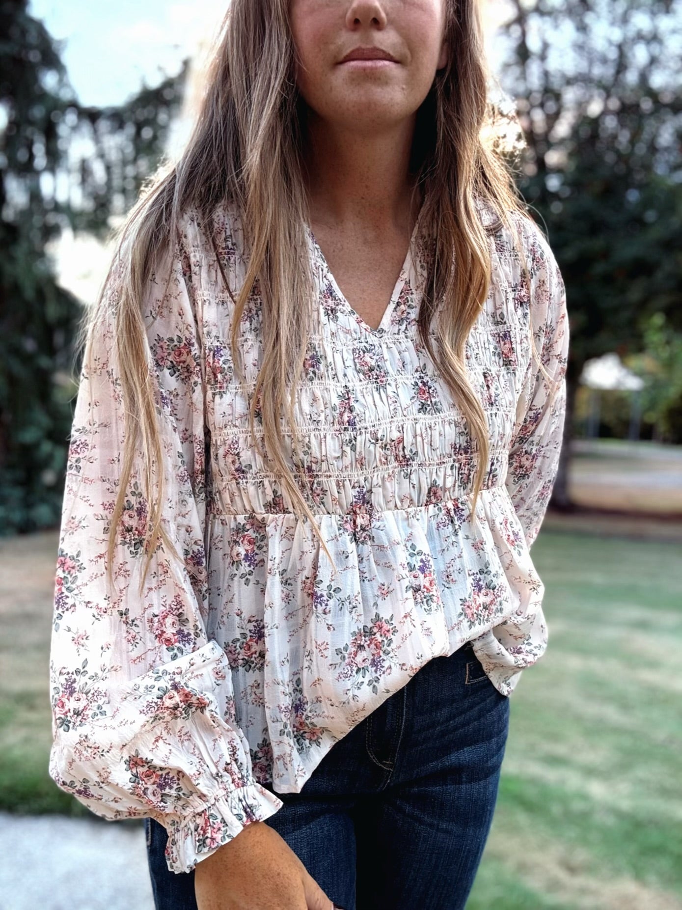 Add a fun flair to your daily style with this charming floral top. Crafted from light, breezy fabric, it boasts a gently smocked bodice to hug you just right, plus puffy balloon sleeves finished with gathered cuffs for a sweet and romantic vibe.