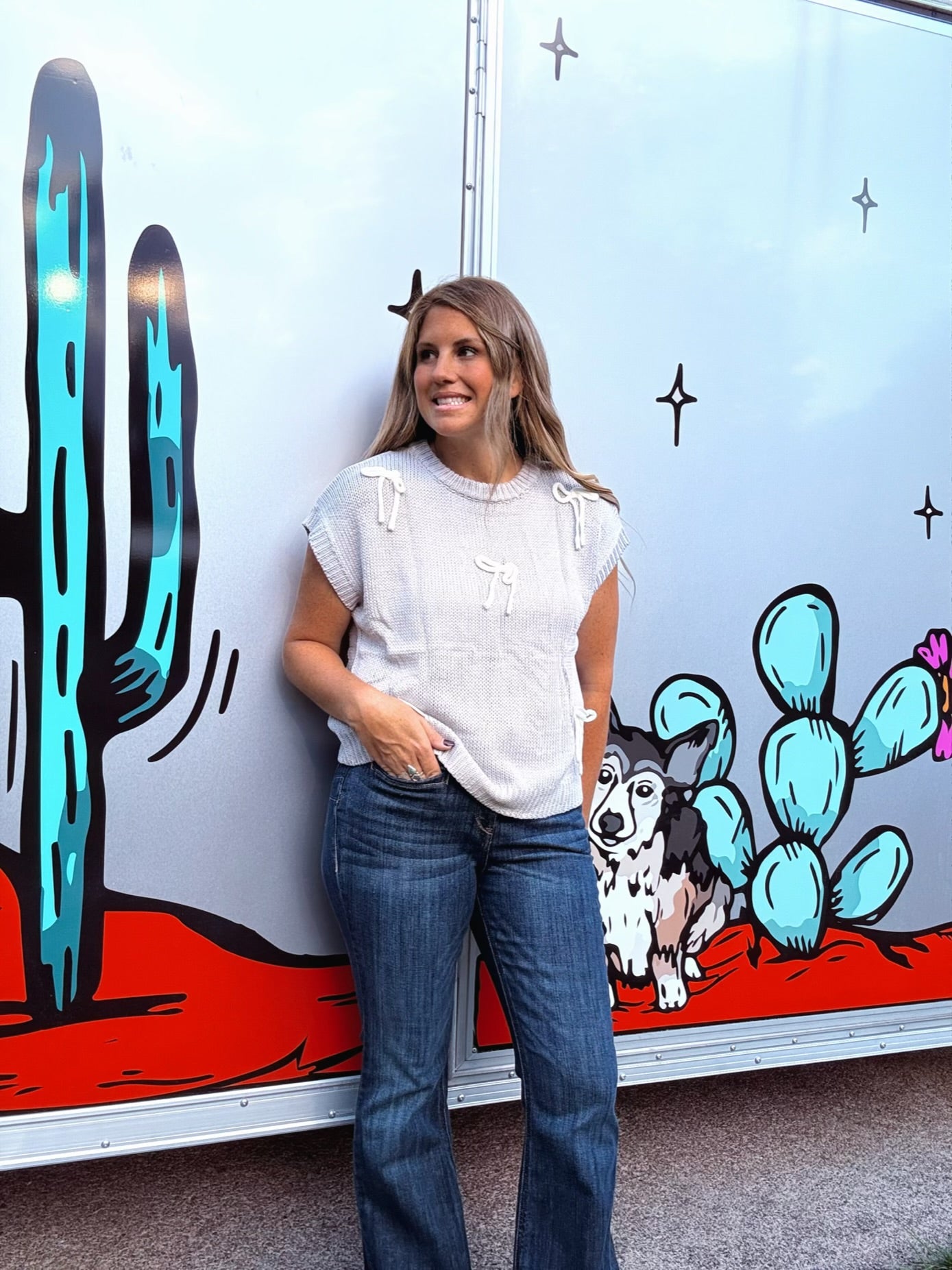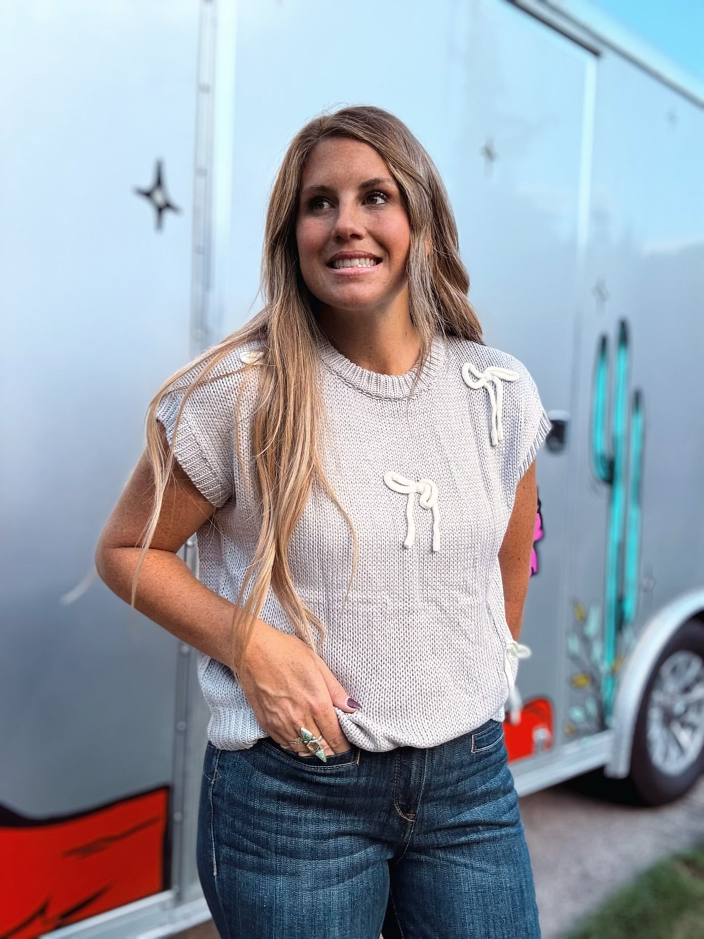 Sweet meets chic in this lightweight knit sweater. Designed in a soft light gray hue, it features playful bow accents along the shoulders and sides for a feminine touch. The short-sleeve silhouette and breathable knit make it perfect for layering through the seasons, whether styled casually with denim or dressed up with a skirt and boots.
