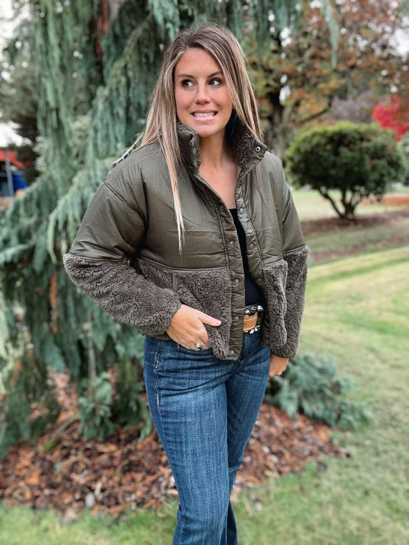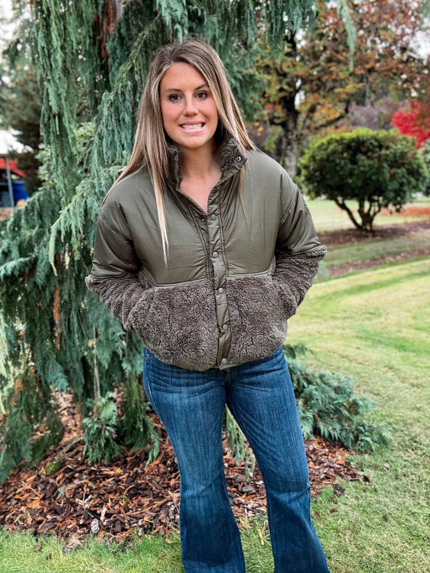 The perfect versatile layer featured in a mix fabric combo, top half is nylon, bottom half is faux sherpa, and the body is lined in a soft jersey. The olive green color is super pretty and will definitely go with a lot of options.Â