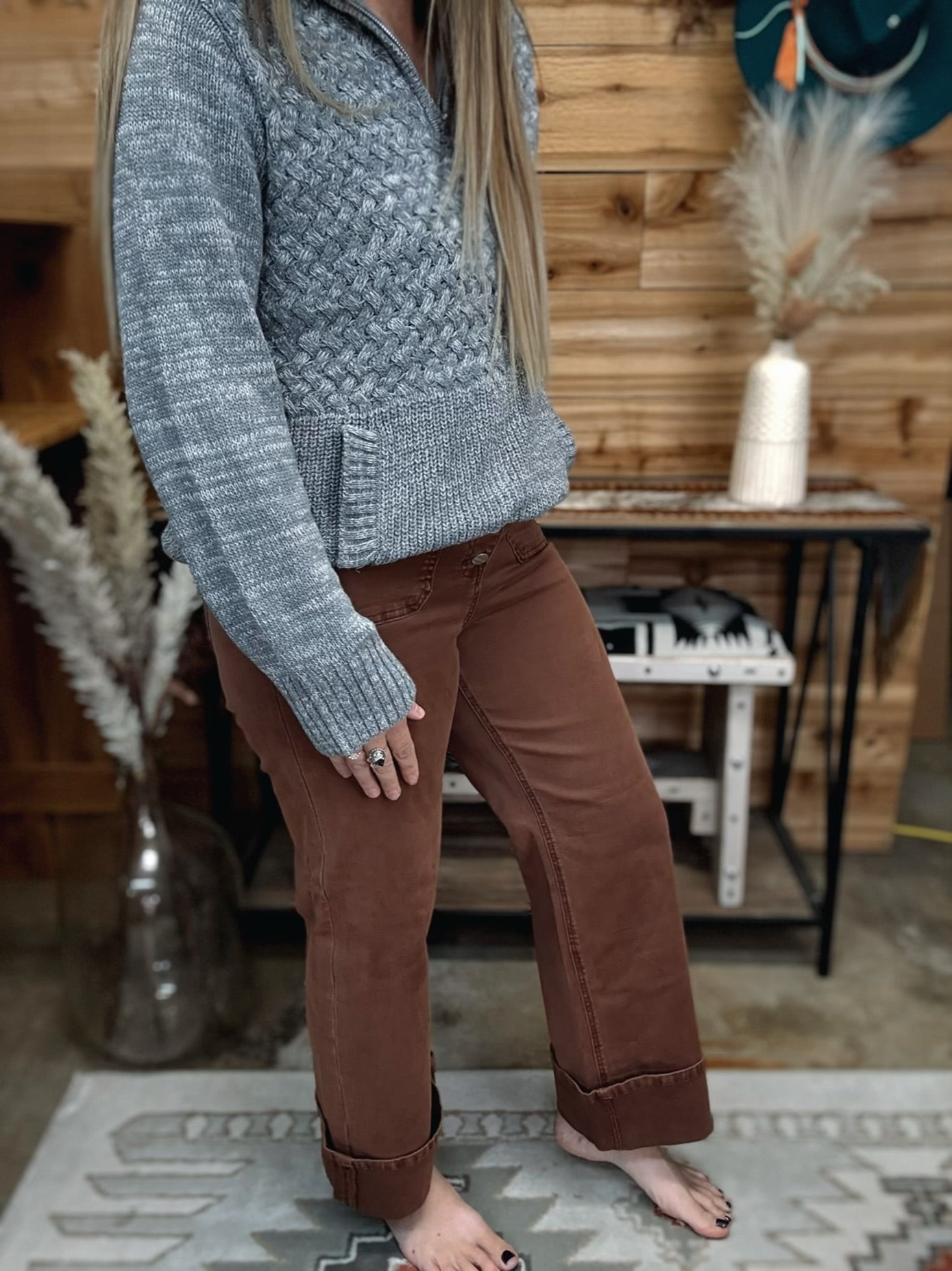 How cute are these espresso high rise cuffed pants?! I am loving the color and the button fly front. These have the perfect cuff and are super comfortable.