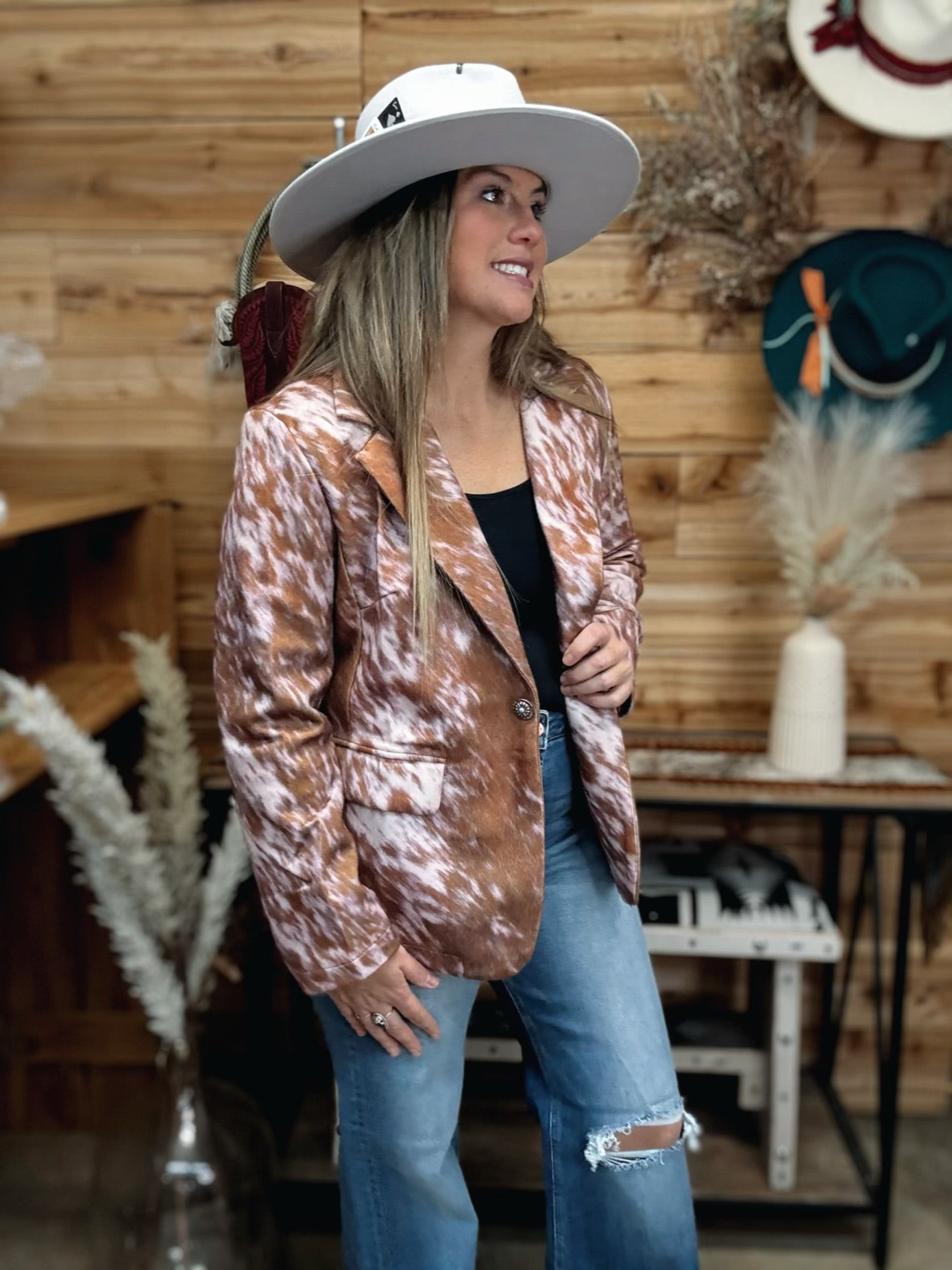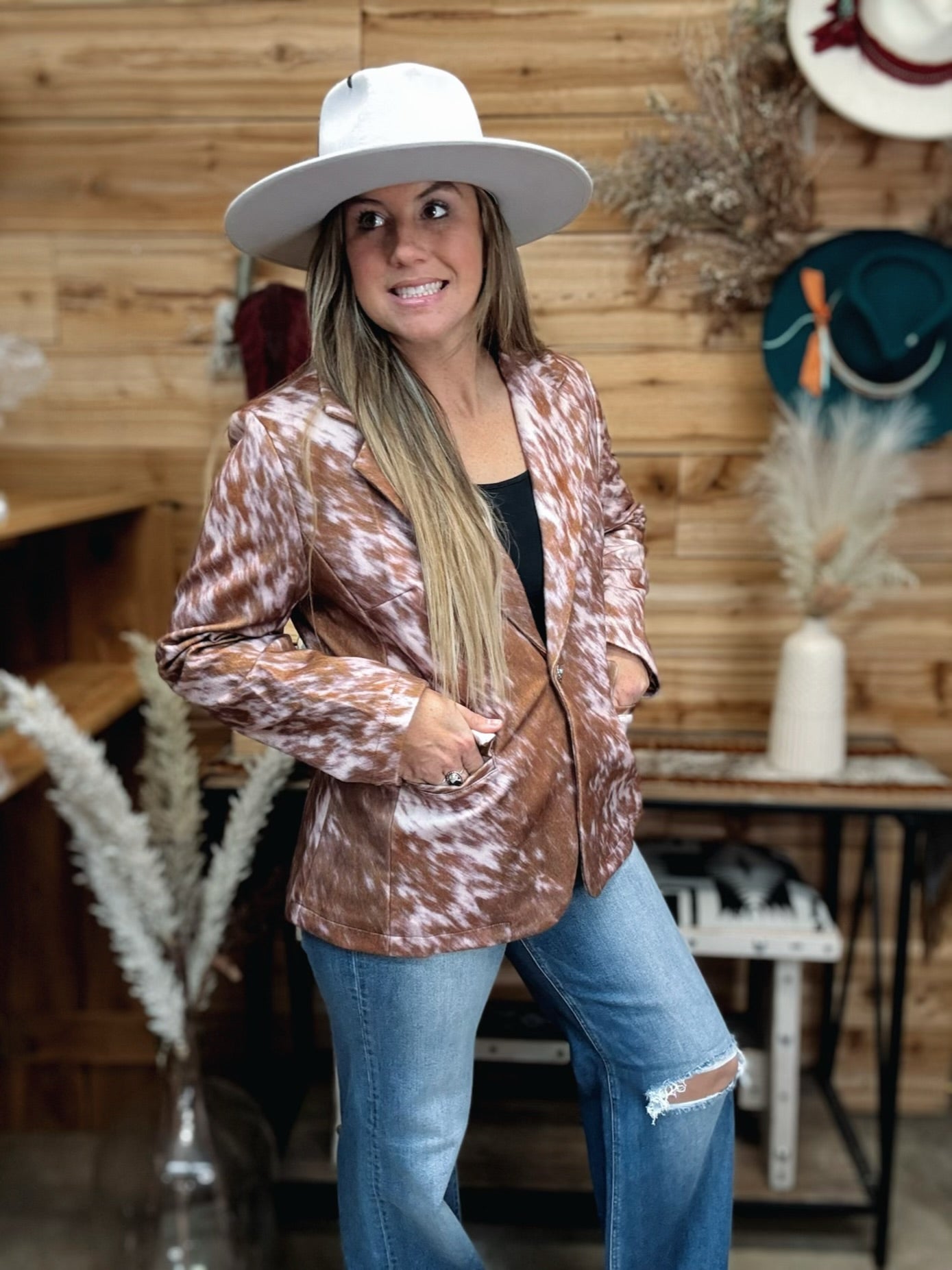 Make a bold statement in this beautiful blazer, featuring an eye-catching cowhide pattern that adds a unique edge to your wardrobe. Designed to stand out, this blazer effortlessly combines classic tailoring with wild style, perfect for elevating any outfit. Whether at a casual gathering or a night out, this blazer brings confidence and character to your look. NOT real cowhide, just a print, but it feels like hair. The cow print has a slight pink hue which you can see in some of the pictures. This Blazer doesn't have much stretch as I sized up to an XL.Â