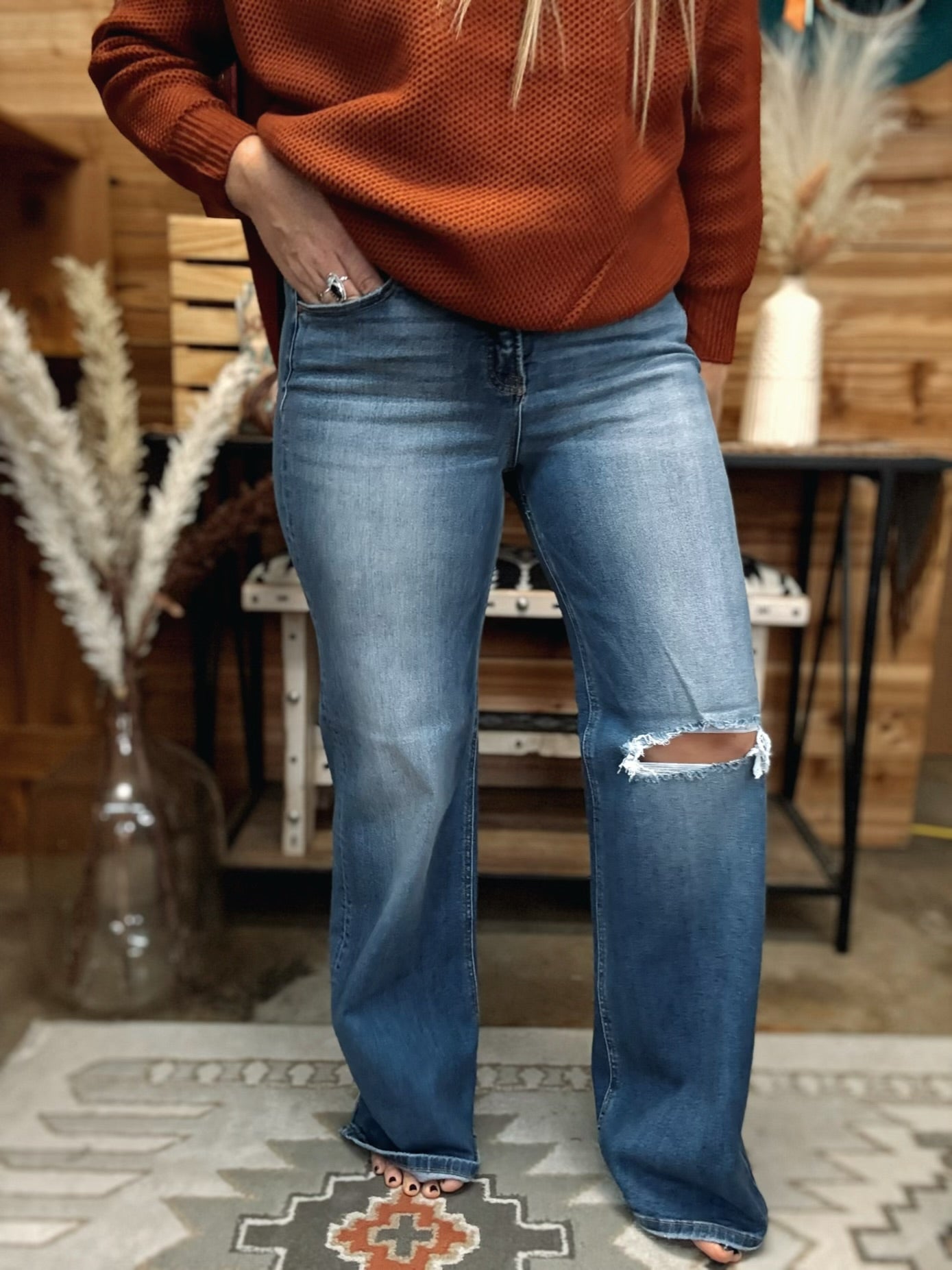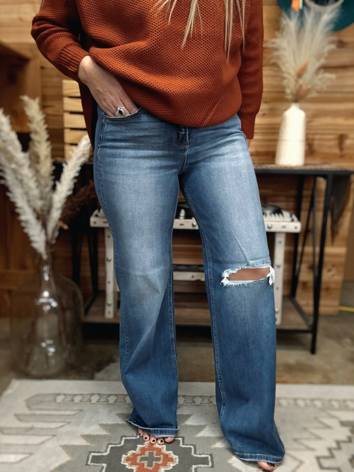 • Load image into Gallery viewer, High Rise Wide Leg Distressed Knee