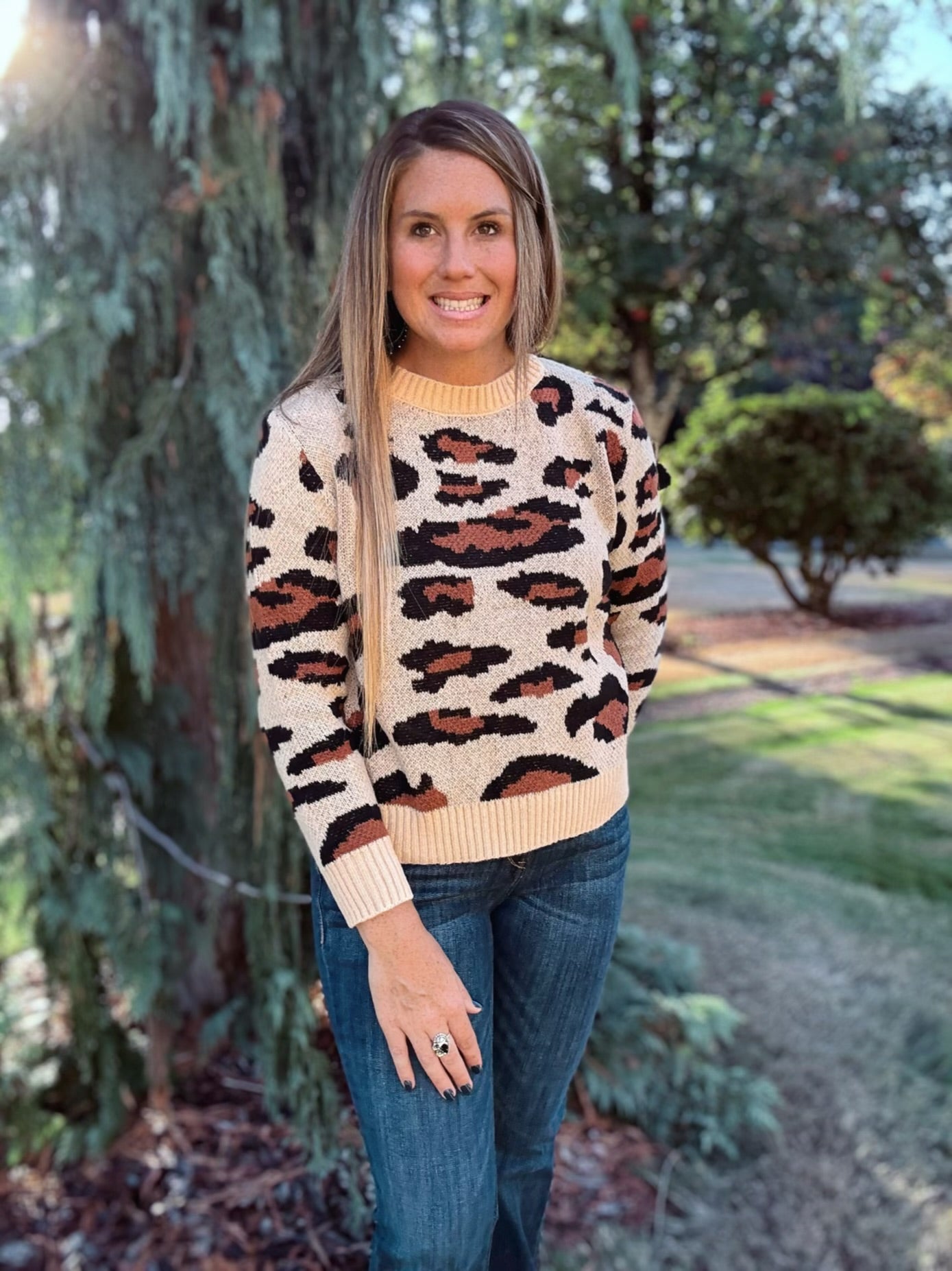 Add a pop of fierce to your fall wardrobe with this cozy leopard print pullover sweater. Featuring a bold mix of warm neutrals and animal print accents. The classic crew neckline, ribbed cuffs, and hem keep it casual yet chic, while the soft knit makes it an instant go-to for everyday wear.