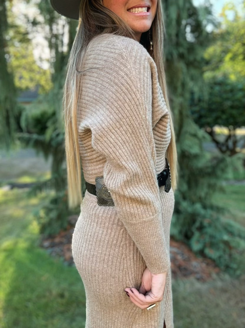 Get ready to meet your new fall obsession! This cozy ribbed sweater dress mixes comfy vibes with western flair. The flattering midi length and cute side slit add just the right amount of sass.Pair it with boots and a belt or sneakers for a fun, casual feel. Whether you’re brunching or bundling up, this dress is destined to be your wardrobe’s new best friend.