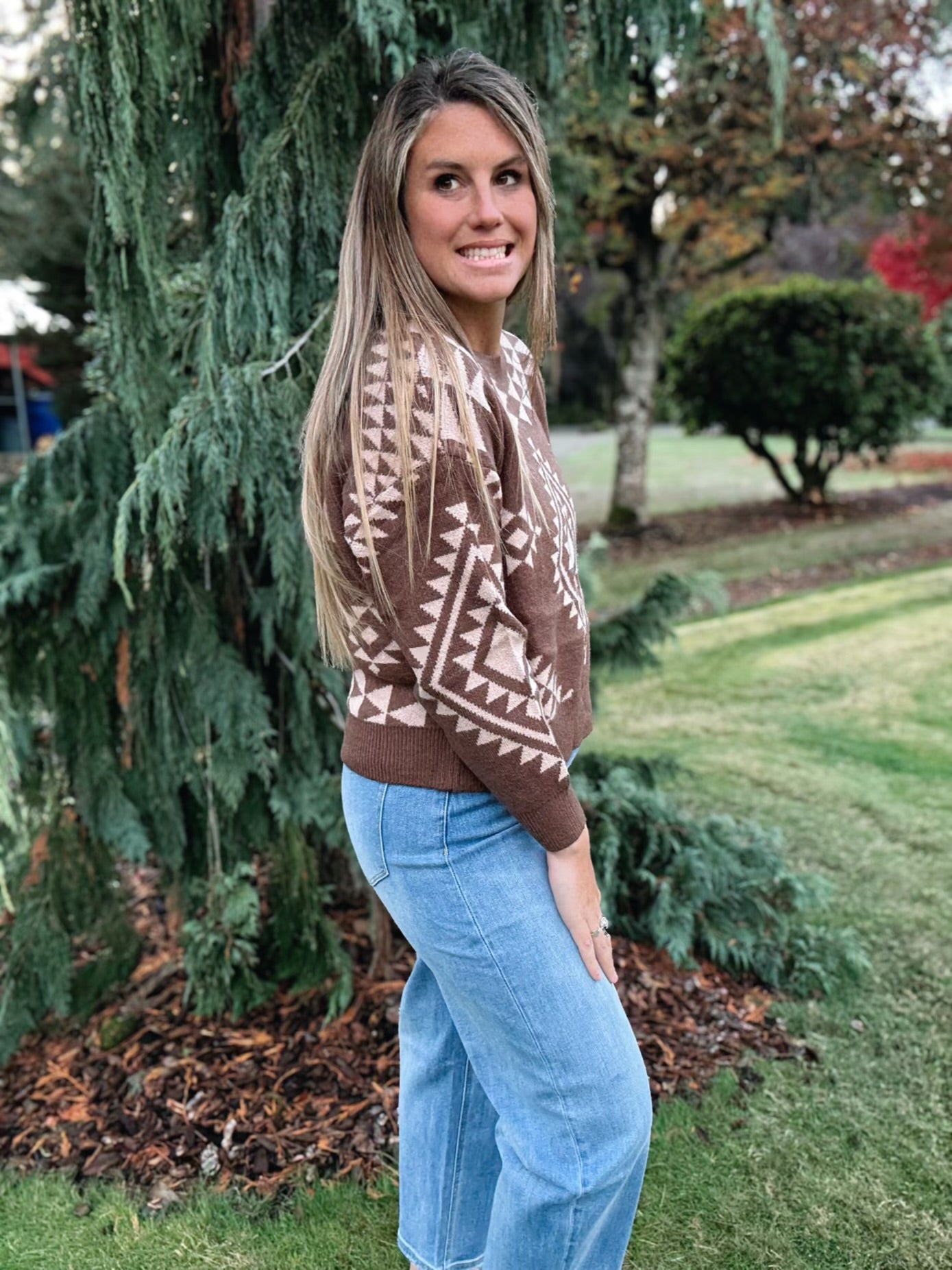 Add cozy charm with rugged western flair to your fall lineup. This mocha-brown and beige sweater features a jacquard western pattern that pairs perfectly with crisp denim and boots—easy, effortless, and NFR-ready.