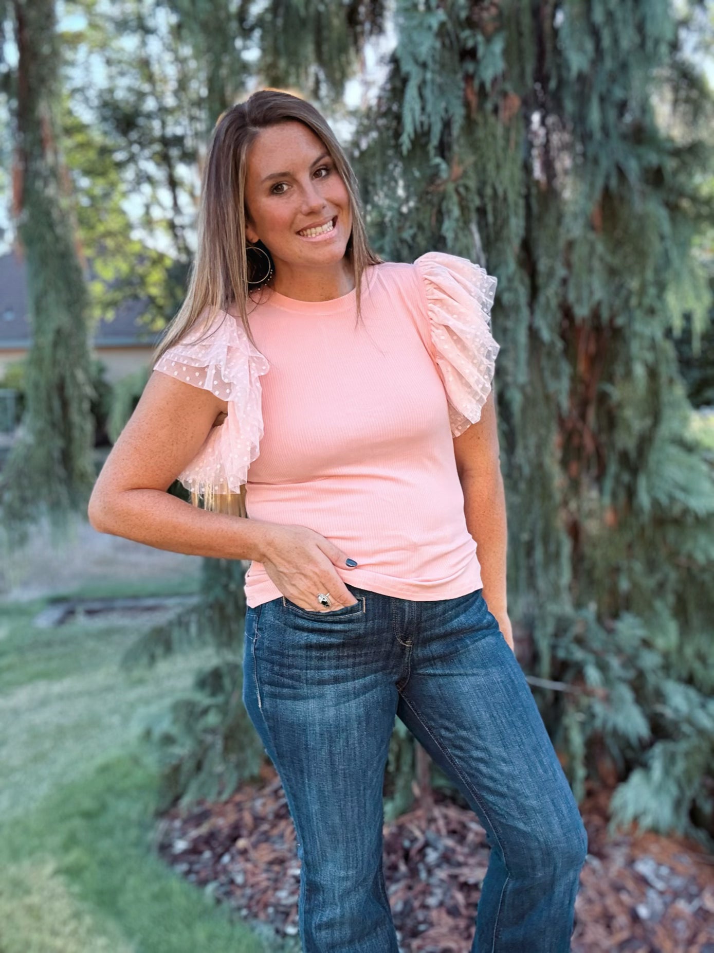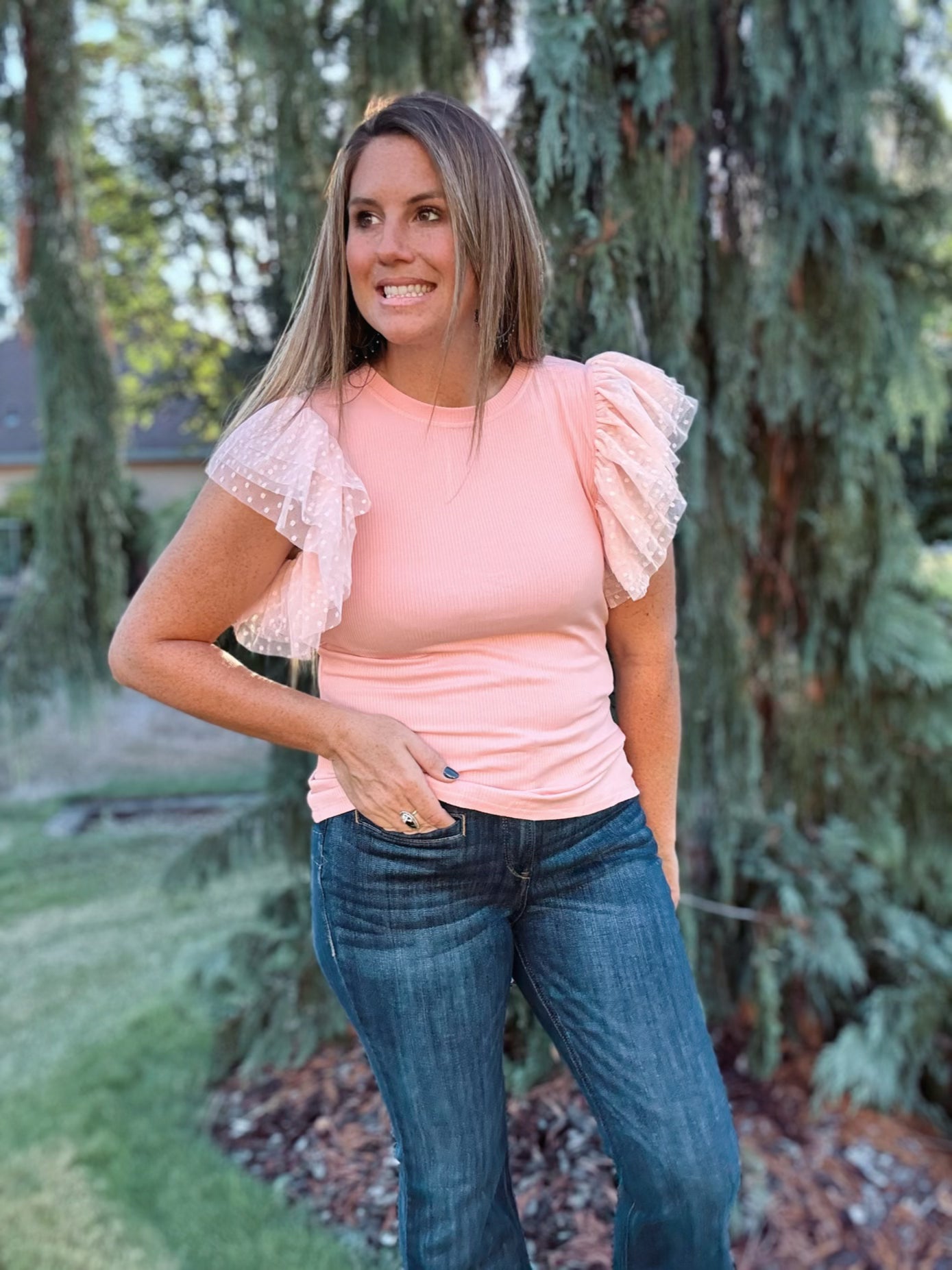 The Dottie Mesh Ruffle Top is everything you need in a closet staple with a playful twist. Made from a soft ribbed fabric, this top is designed with a slightly fitted silhouette that flatters your shape while keeping you comfortable all day long.