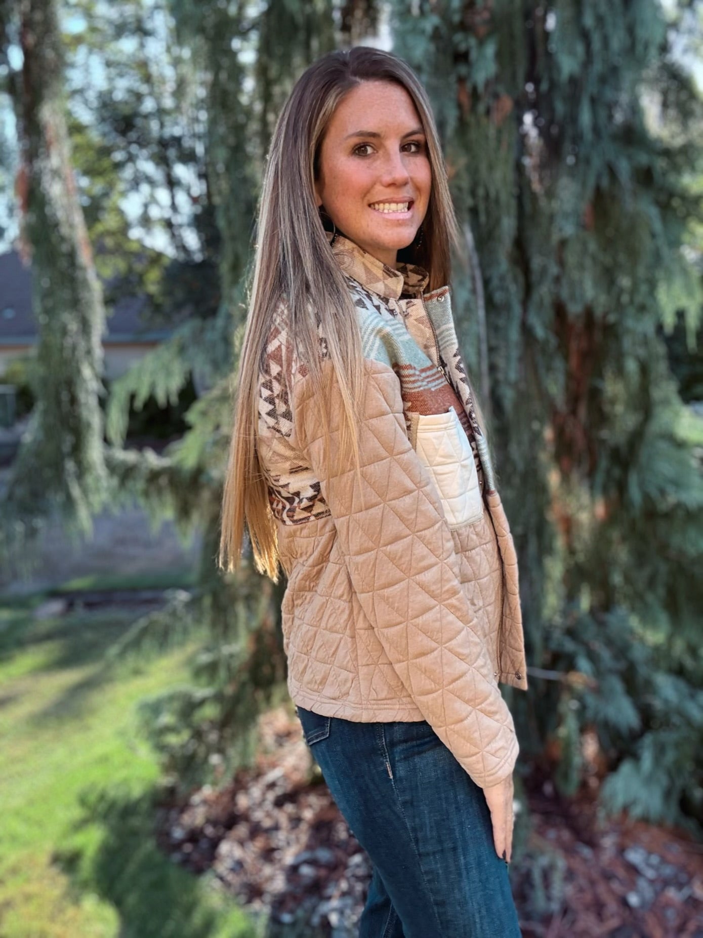 Stay cozy in style with this lightweight quilted patchwork western jacket. Designed with a mix of quilted panels and southwestern-inspired prints, it brings the perfect blend of comfort and western flair. The zip-up front with snap-button closures makes it easy to wear, while the lightweight feel ensures it’s ideal for layering throughout the seasons.