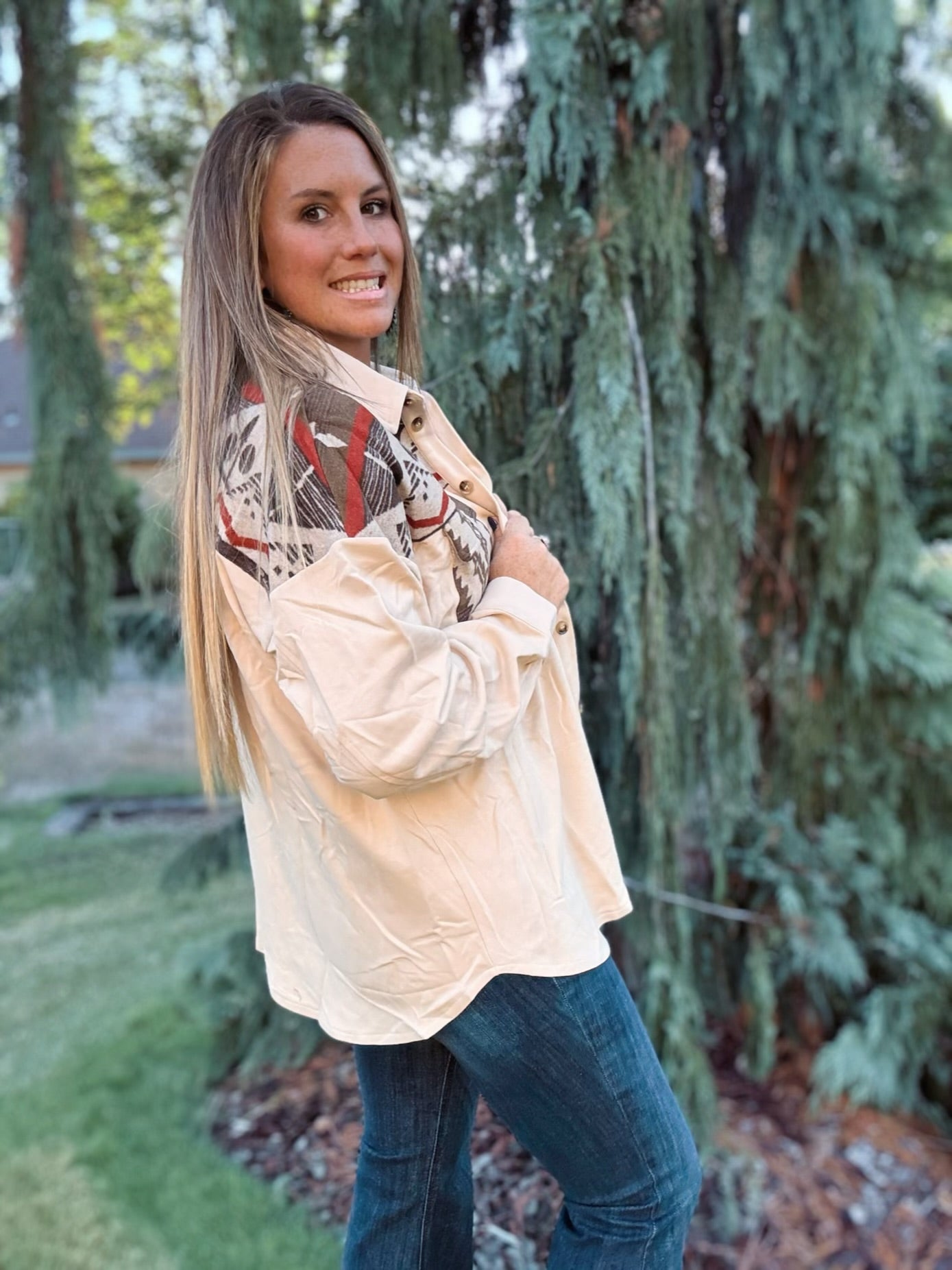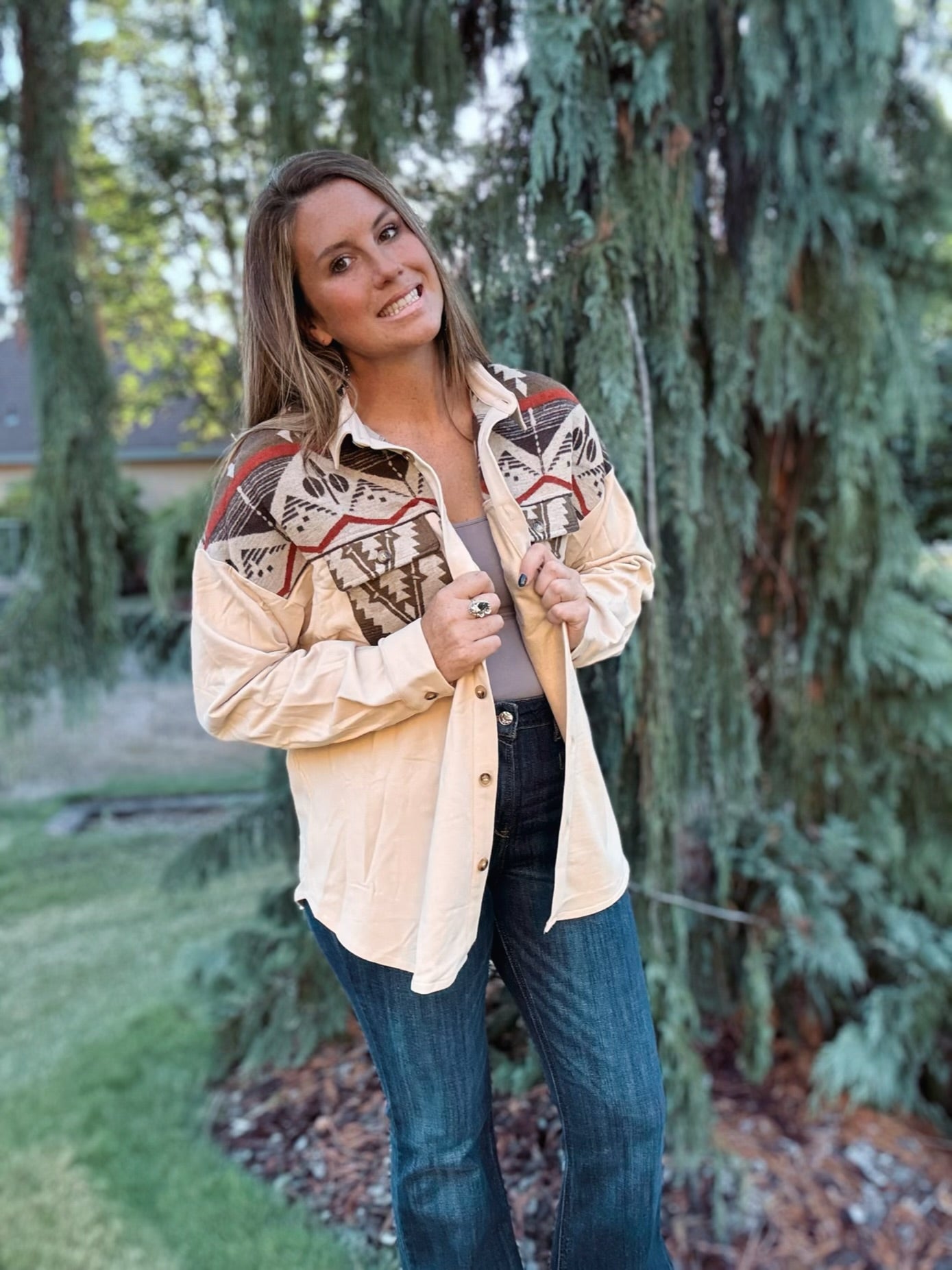 This shirt jacket is stylish and incredibly versatile. This is a must-have layering piece for the season. Designed in a beautiful stone color with bold Aztec-inspired patterns across the chest and shoulders, this jacket combines a cozy feel with standout Western vibes.