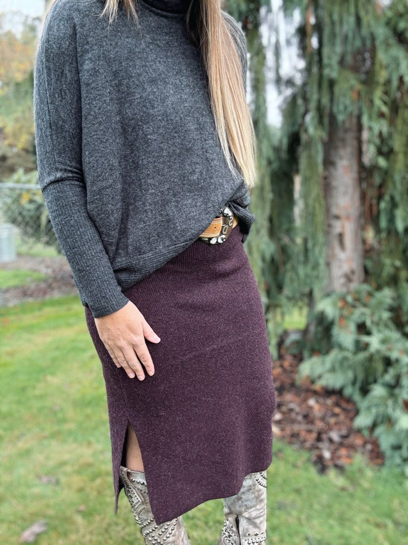 A true effortless essential, this classic midi is featured in the perfect knit fabrication for a cozy feel with an elastic waistband and side slits. Wear with the Dani Sweater to complete the matching set!