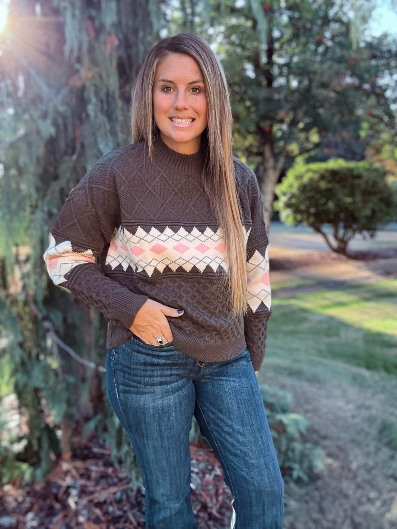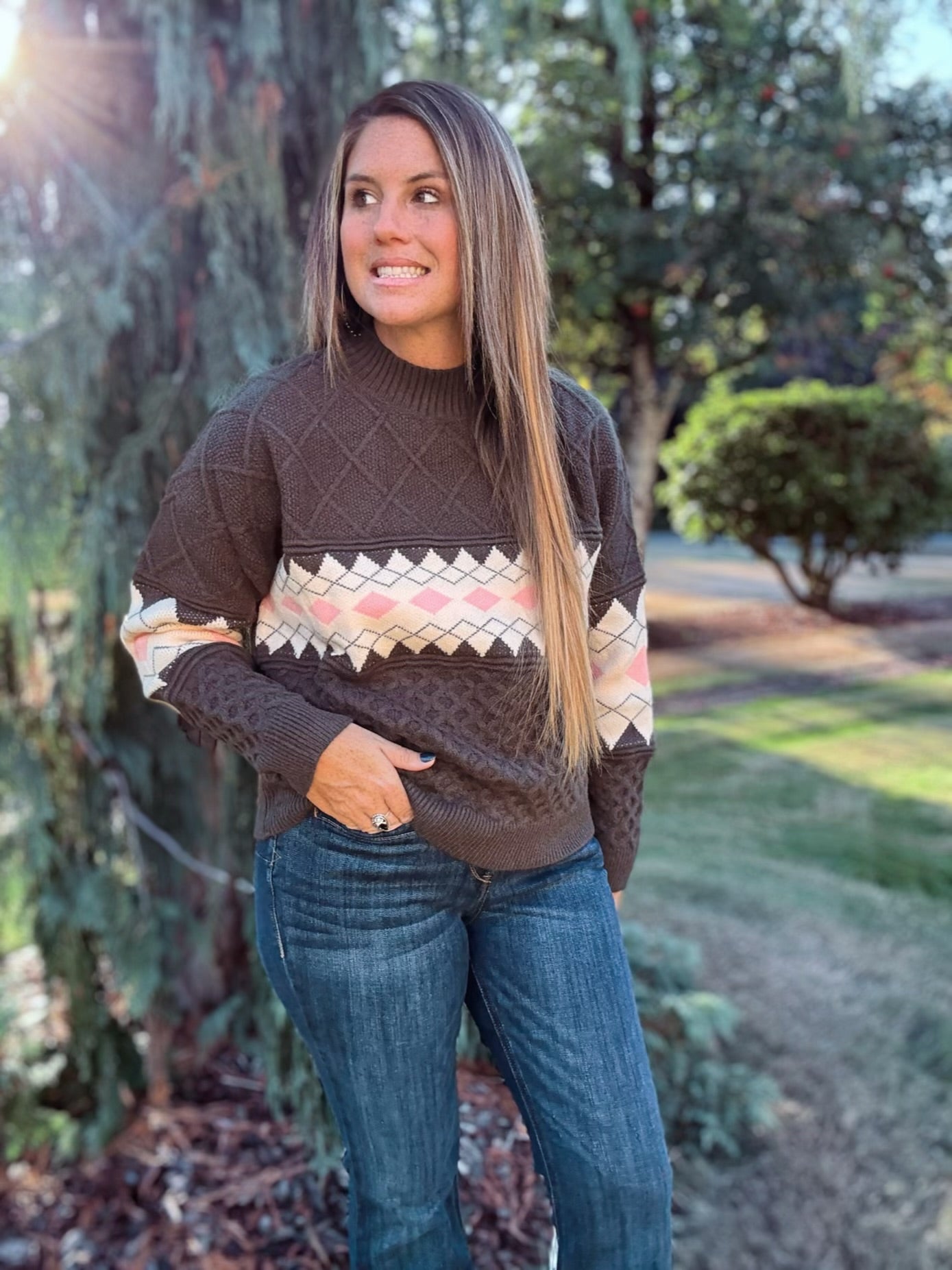 The cozy sweater your fall wardrobe’s been waiting for. This Waffle Classic Sweater in a rich charcoal hue features an intricate textured knit paired with a diamond design in soft pinks and creams.Â