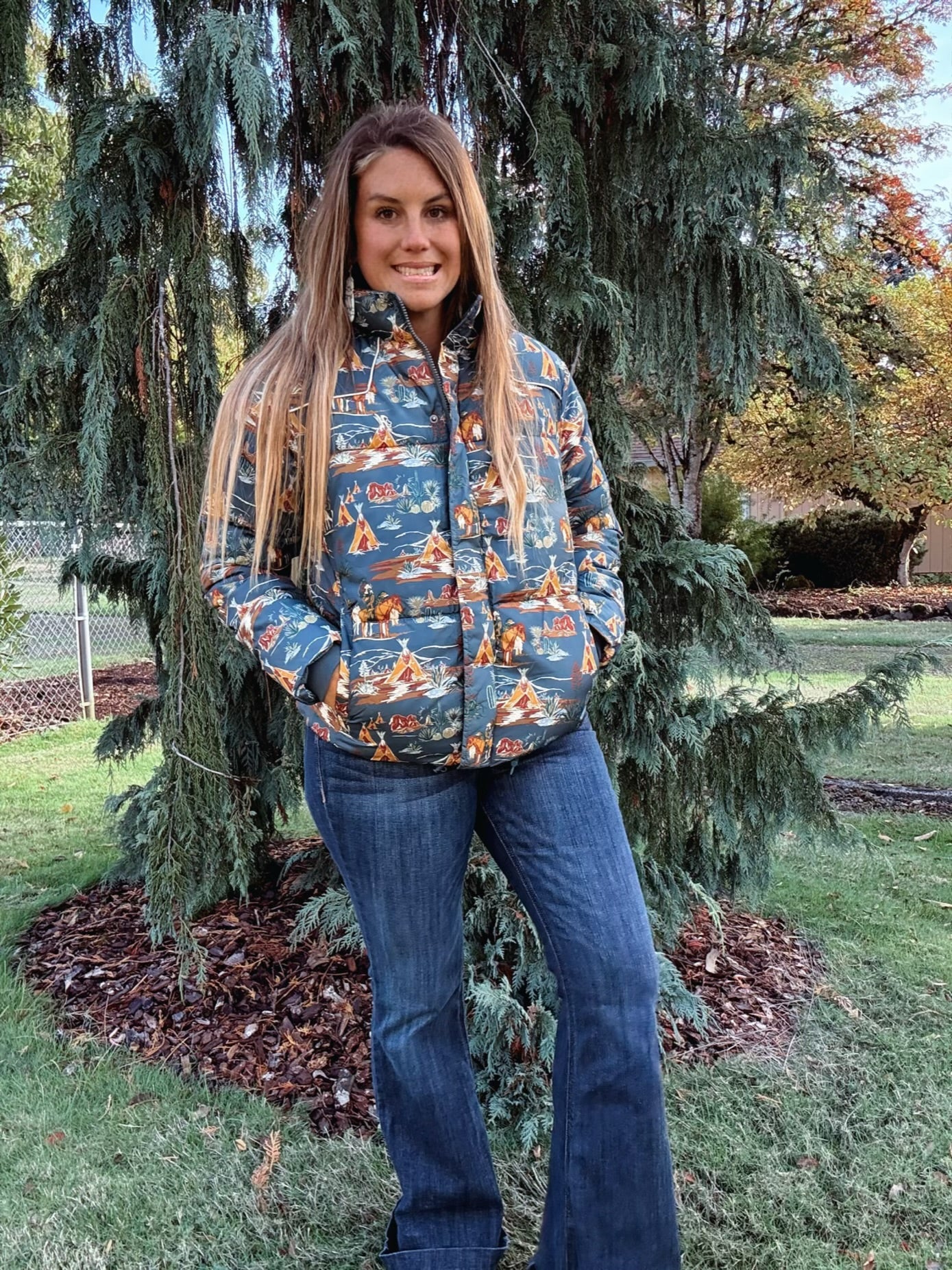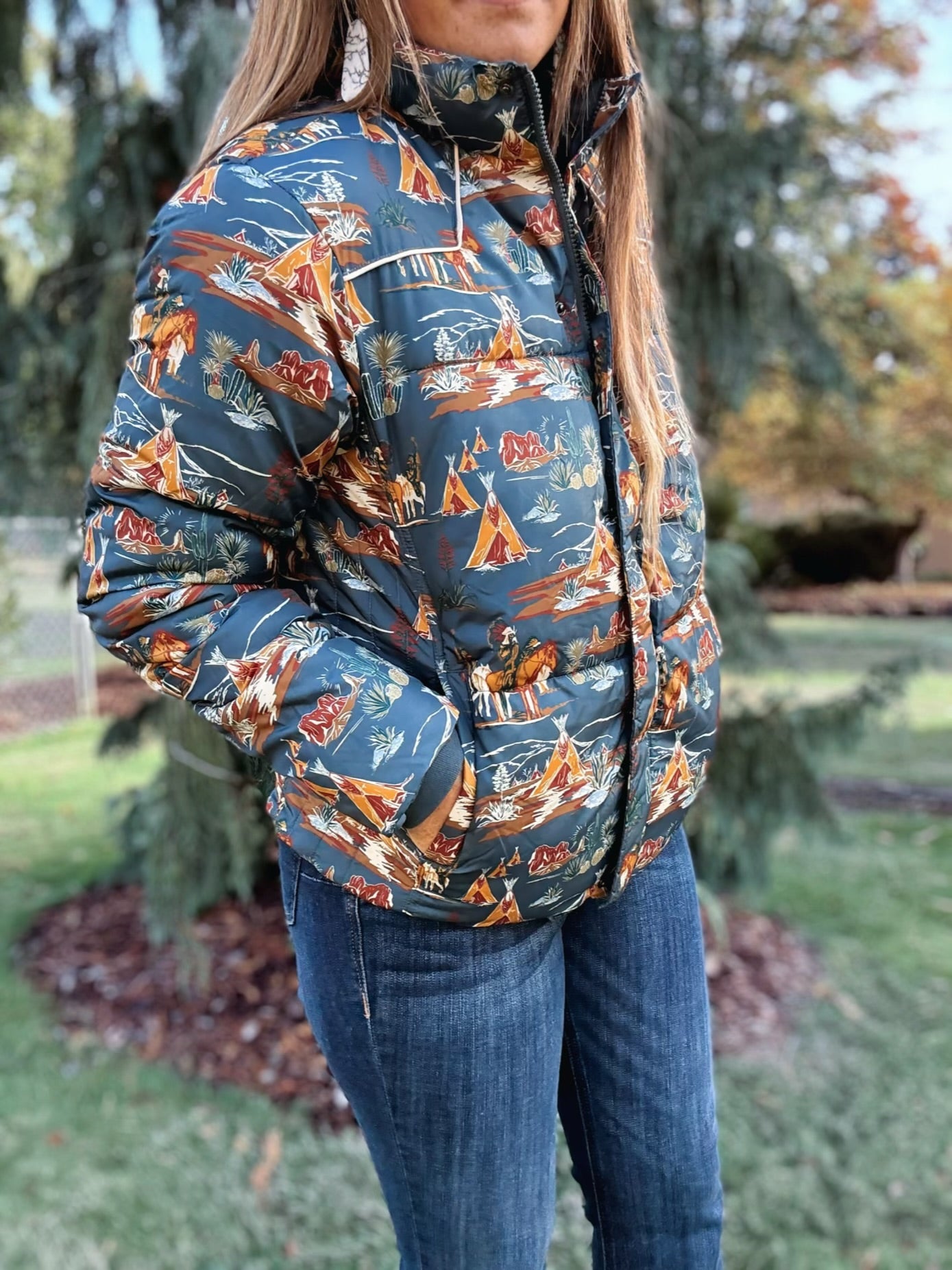 This western puffer is bringing all the cozy vibes with a bold, playful twist. Featuring an eye-catching western scene print (we’re talking teepees, cowboys, and cacti), it’s a total standout for chilly days.