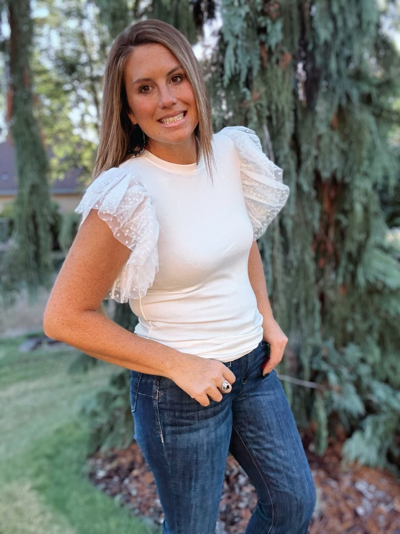 The real showstopper? The sheer mesh ruffle sleeves with subtle dotted detailing that add the perfect touch of charm and drama. Pair it with jeans for an elevated casual look, or dress it up with a skirt and heels for a night out.
