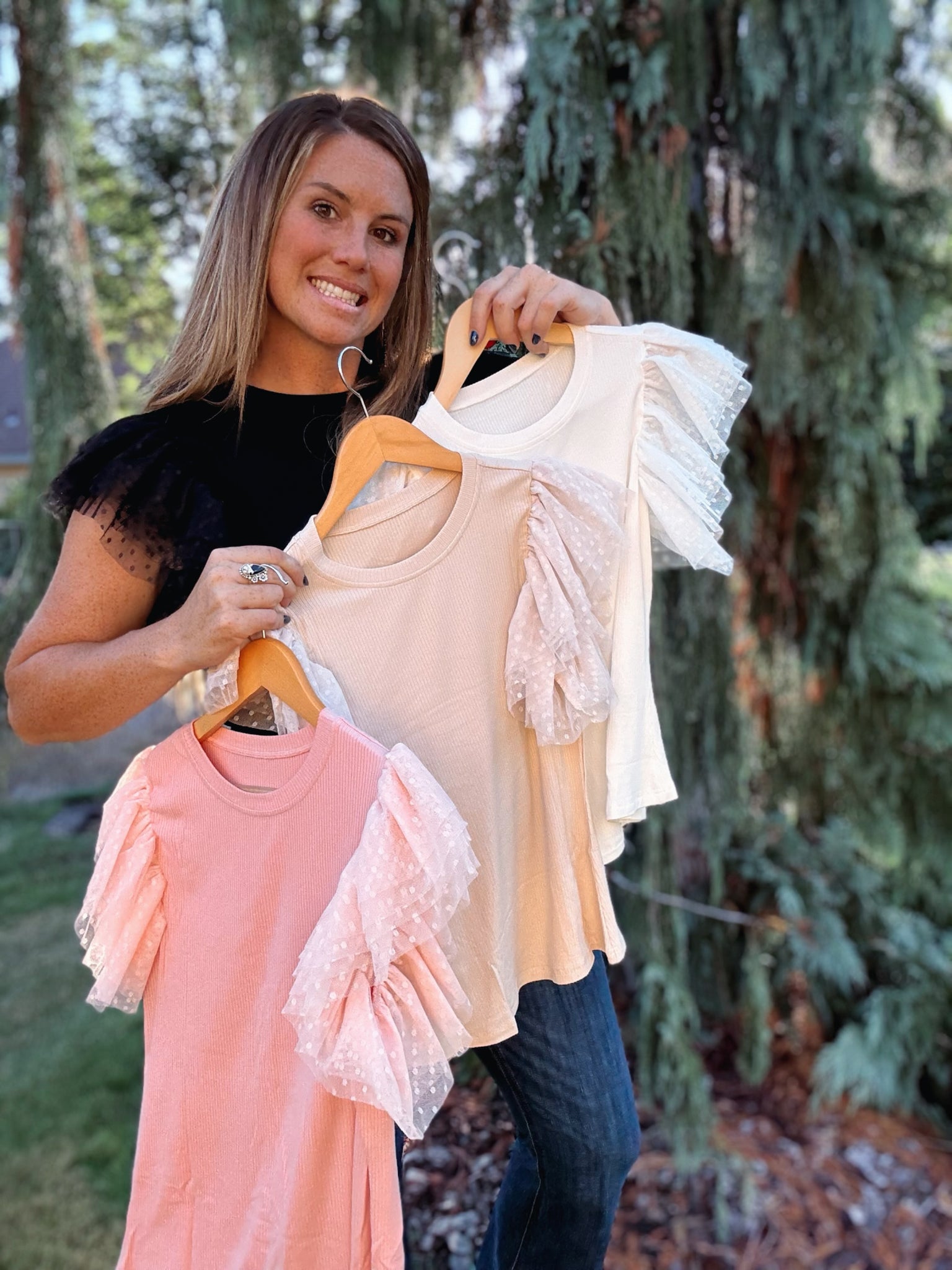 The Dottie Mesh Ruffle Top is everything you need in a closet staple with a playful twist. Made from a soft ribbed fabric, this top is designed with a slightly fitted silhouette that flatters your shape while keeping you comfortable all day long.